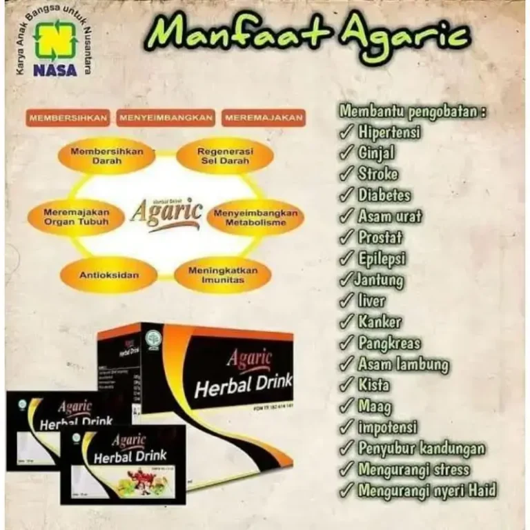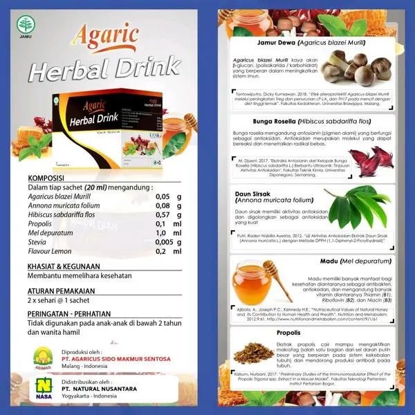 Badan cepat lelah, daya tahan terasa turun, butuh minuman herbal yang praktis dibawa ke mana saja? Agaric Herbal Drink NASA Natural Nusantara memadukan ekstrak jamur Agaricus blazei, daun sirsak, rosella, propolis, madu murni, stevia, dan rasa lemon dalam sachet siap minum untuk dukungan kesehatan harian.