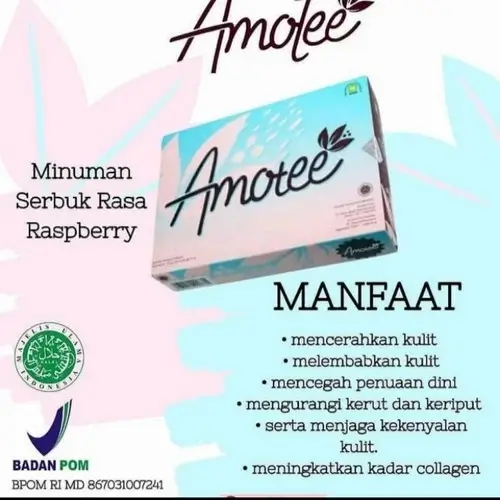 AMOTEE adalah suplemen berbentuk minuman serbuk yang diformulasikan untuk perawatan kesehatan kulit dan kecantikan dari dalam. Formulanya memadukan kolagen ikan (fish collagen) yang mudah diserap tubuh, L-glutathion sebagai antioksidan, vitamin C yang mendukung pembentukan kolagen, serta kombinasi bahan pendukung skin barrier dan hidrasi seperti phyto ceramide dan sodium hyaluronat.
