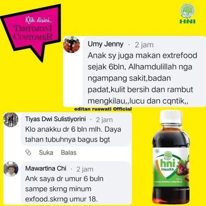 Di dalamnya terdapat kombinasi sayur dan buah seperti bayam merah, wortel, beras hitam, rosella ungu, blueberry, blackberry, strawberry, anggur hitam, serta plum hitam. Formula ini juga dilengkapi bahan herbal dan tanaman pilihan seperti habbatussauda, zaitun, daun ashitaba, curcuma, kulit manggis, daun sirsak, spirulina, daun stevia, dan meniran. Dengan sinergi bahan-bahan tersebut, HNI Health cocok dijadikan pelengkap rutinitas harian keluarga untuk membantu menjaga kondisi tubuh tetap prima.