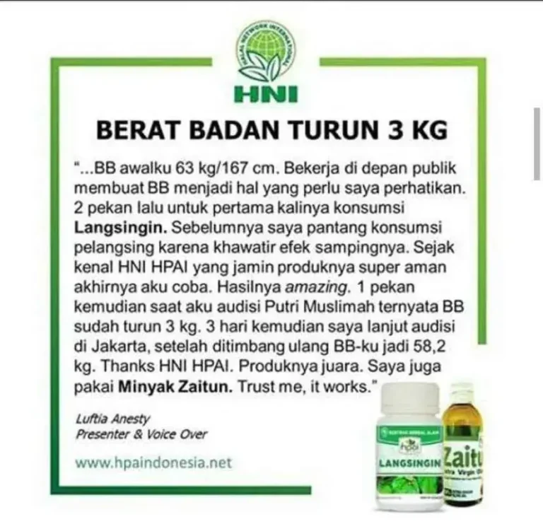 LANGSINGIN adalah suplemen herbal kapsul dari HNI yang dirancang sebagai pendamping program pengelolaan berat badan. Formulasinya memadukan berbagai ekstrak tanaman tradisional yang dikenal luas dalam pola hidup sehat, seperti daun jati belanda, daun ketepeng, daun kemuning, kunci pepet, bangle, dan daun teh. Kombinasi ekstrak ini ditujukan untuk membantu mengurangi lemak sekaligus mendukung upaya menurunkan berat badan secara bertahap ketika diiringi kebiasaan makan seimbang, hidrasi cukup, dan aktivitas fisik yang konsisten.