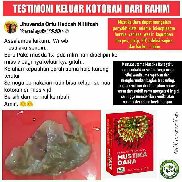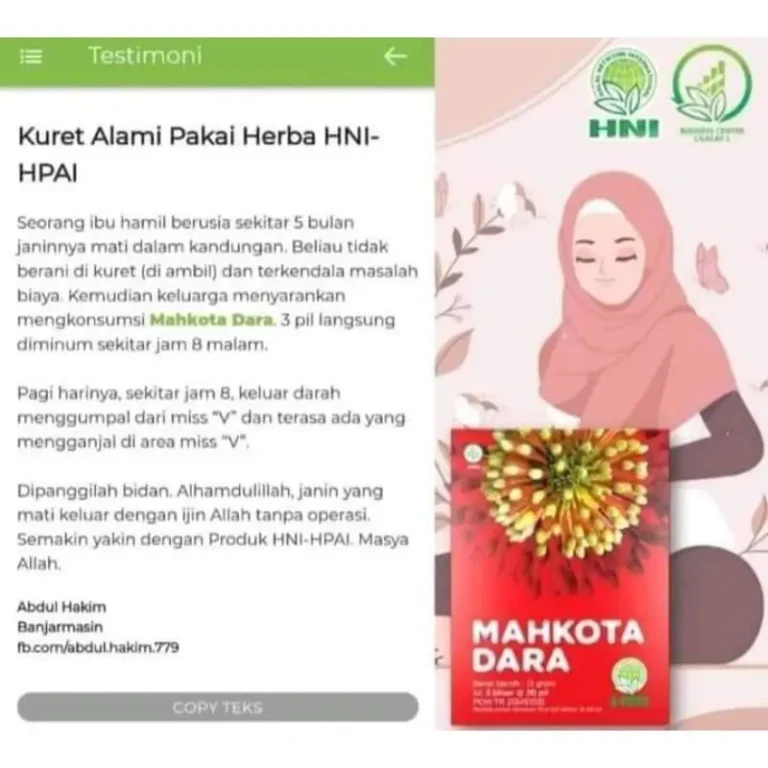 Mahkota Dara adalah produk herbal dari HNI yang diformulasikan untuk perawatan kesehatan kewanitaan, khususnya membantu mengurangi lendir berlebih pada area kewanitaan. Formulanya menggabungkan tiga bahan herbal yang dikenal luas dalam tradisi perawatan wanita: gambir (Uncaria gambir), manjakani (Quercus lusitanica), dan kayu rapet (Parameria laevigata). Mahkota Dara berbentuk pil, praktis dikonsumsi sesuai aturan pakai, dan cocok dijadikan pendamping rutinitas perawatan diri agar tetap nyaman beraktivitas.